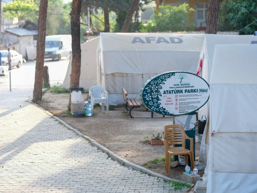 In one of the tent camps in Defne, people have been living in the tents of various aid organizations for months. It’s quiet there, occasionally a child is playing in a meadow. Around the park are destroyed buildings; in the park itself rows of tents.