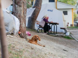 In one of the tent camps in Defne, people have been living in the tents of various aid organizations for months. It’s quiet there, occasionally a child is playing in a meadow. Around the park are destroyed buildings; in the park itself rows of tents.